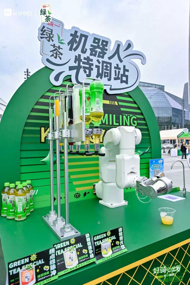 本届上海站以“赛博科技风”为主题,将未来感与运动基因深度融合,成为西岸滨江一道独特的风景线。在统一绿茶品牌展区,机器人茶艺大师成为全场焦点。