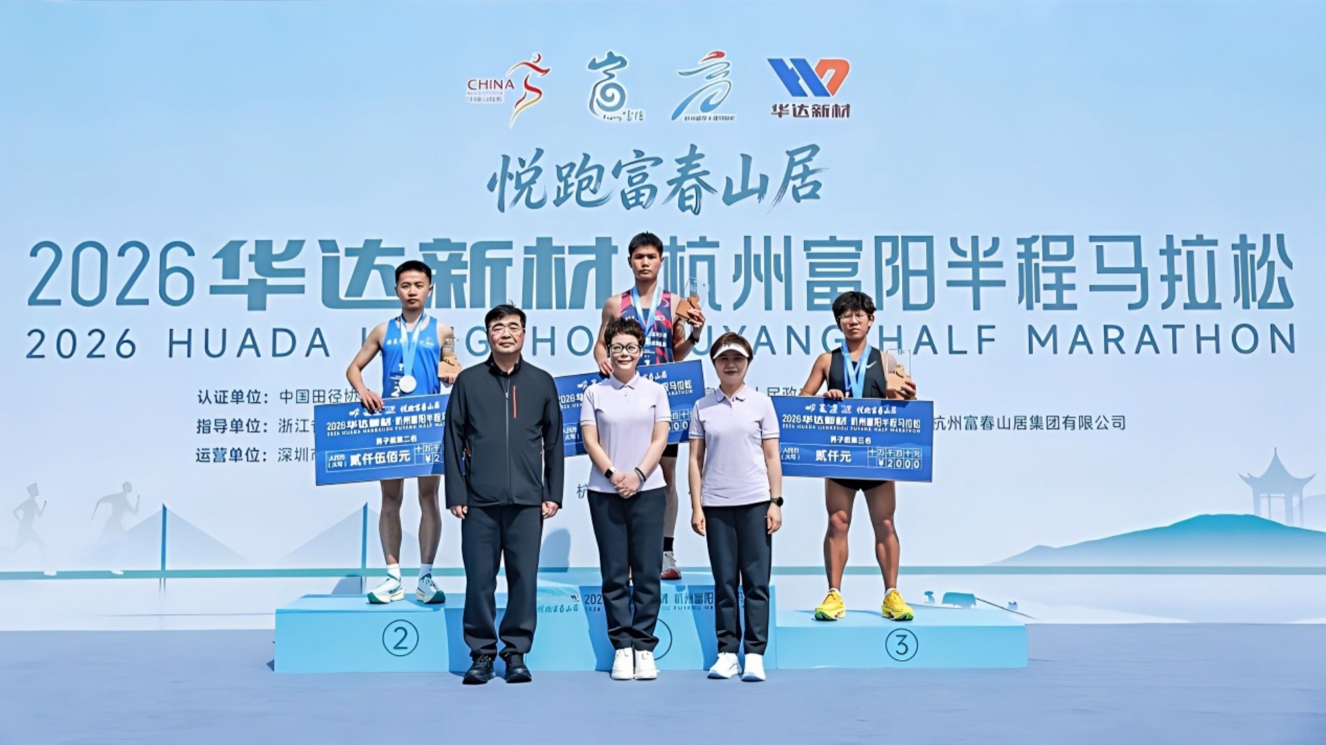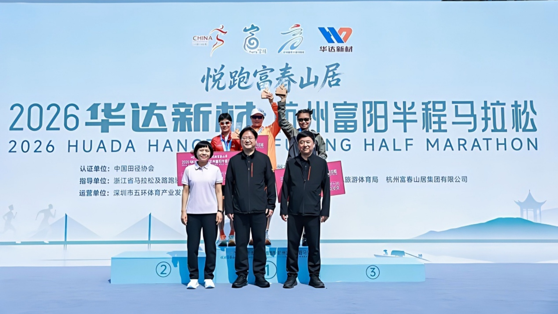 中国田径协会副主席王晓莹,浙江省体育局原党组副书记、副局长,浙江省青少年体育运动联合会会长鲍学军,浙江省体育局群众体育处处长车洁琼,浙江省马拉松及路跑协会会长龙江,杭州文化广播电视集团党委副书记、总编辑夏芬,杭州市体育局党组成员、副局长刘健,富阳区委书记王牮,富阳区委副书记、区长谢渐升,富阳区人大常委会主任徐林亮,富阳区政协主席张霖,富阳区委副书记许海波,浙江华达新型材料股份有限公司董事长邵明祥等领导嘉宾出席起跑仪式,并共同鸣枪发令。